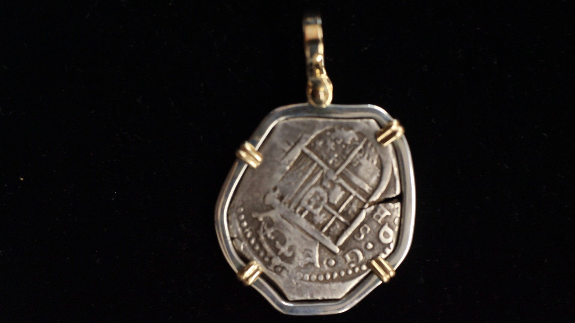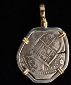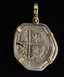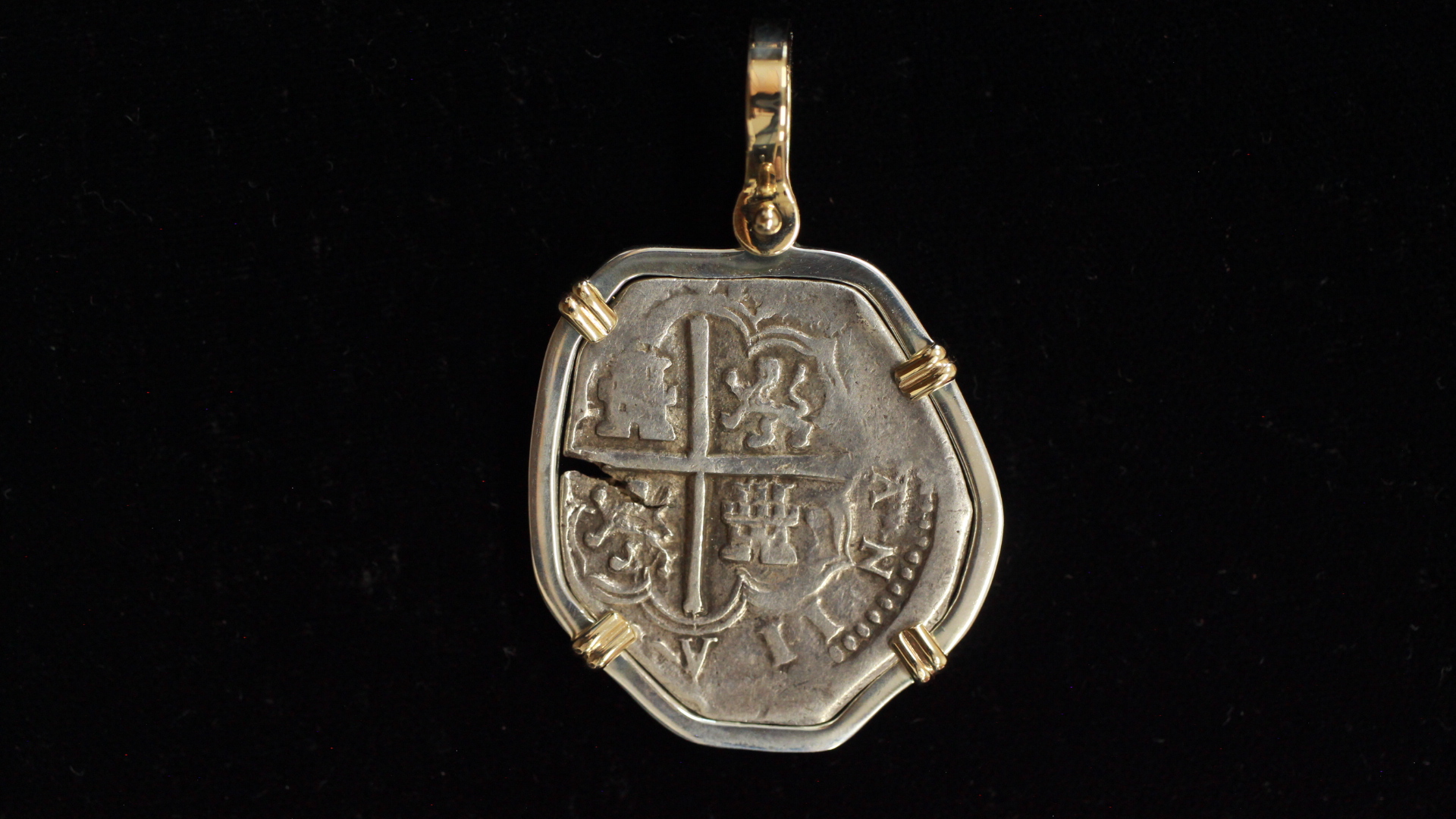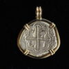 Spanish Colonial four reales mounted in Sterling Silver with gold prongs. Great strikes on cross and shield